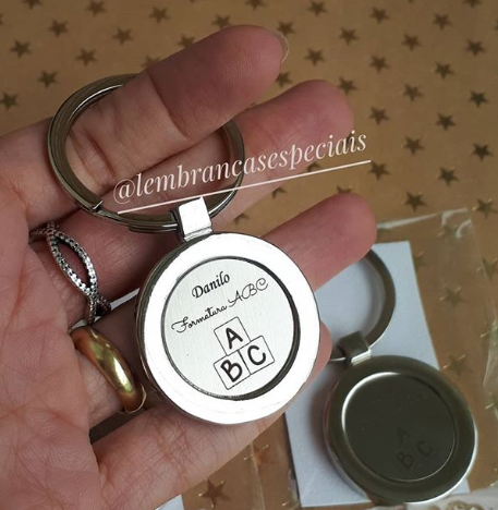 Outra opção que nunca cai de moda e também é super descolada são os chaveiros com gravação definitiva, podendo conter a logo, nome do formando ou ter o formato dos brasões dos cursos, para presentear os convidados!