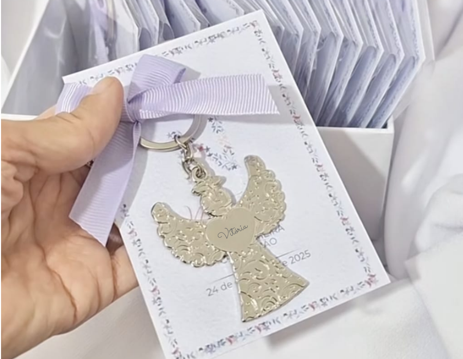 Os mais queridos são nossos Chaveiros de Metal personalizados com a Imagem da Primeira Eucaristia, do Divino Espírito Santo e no formato de Anjo!
